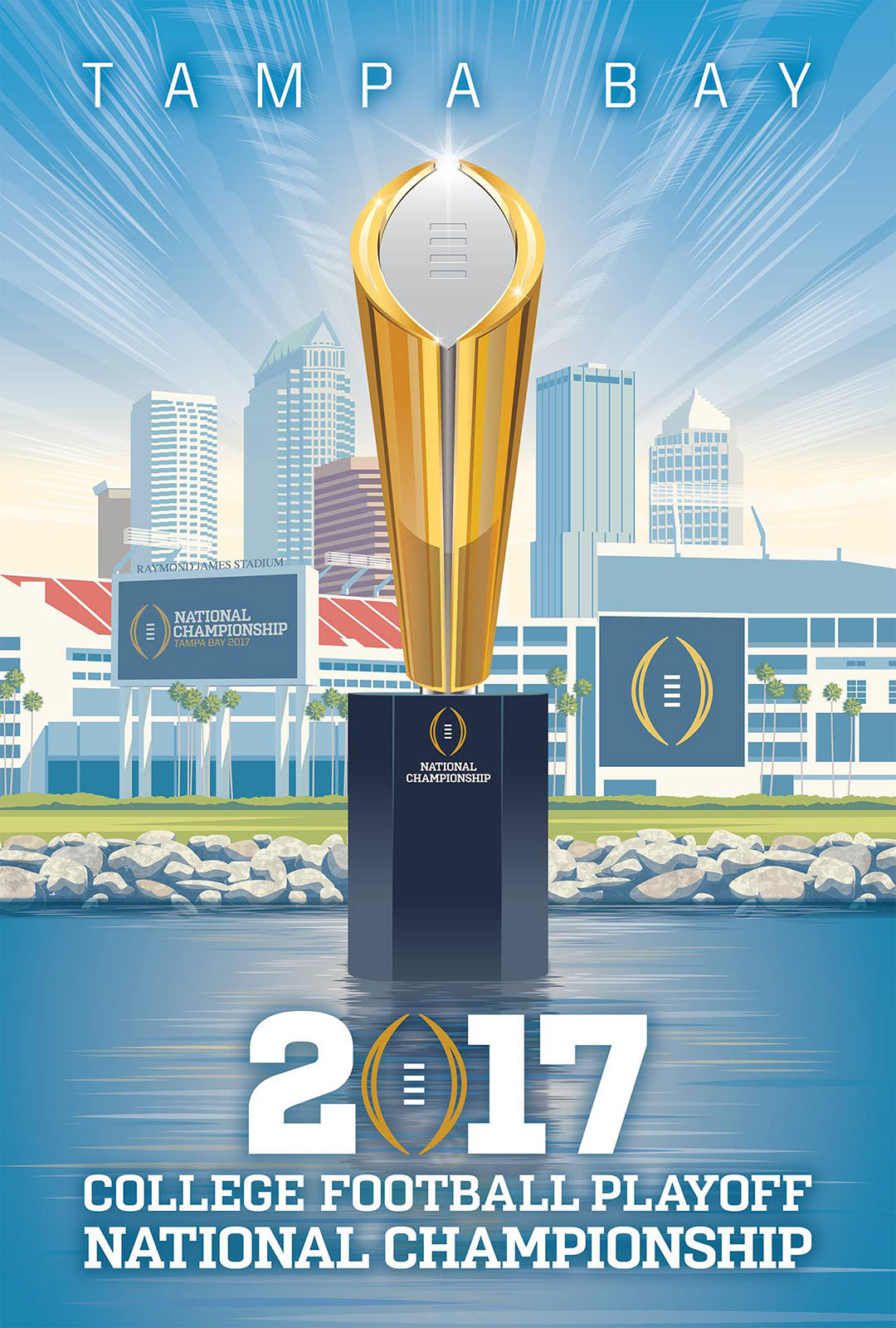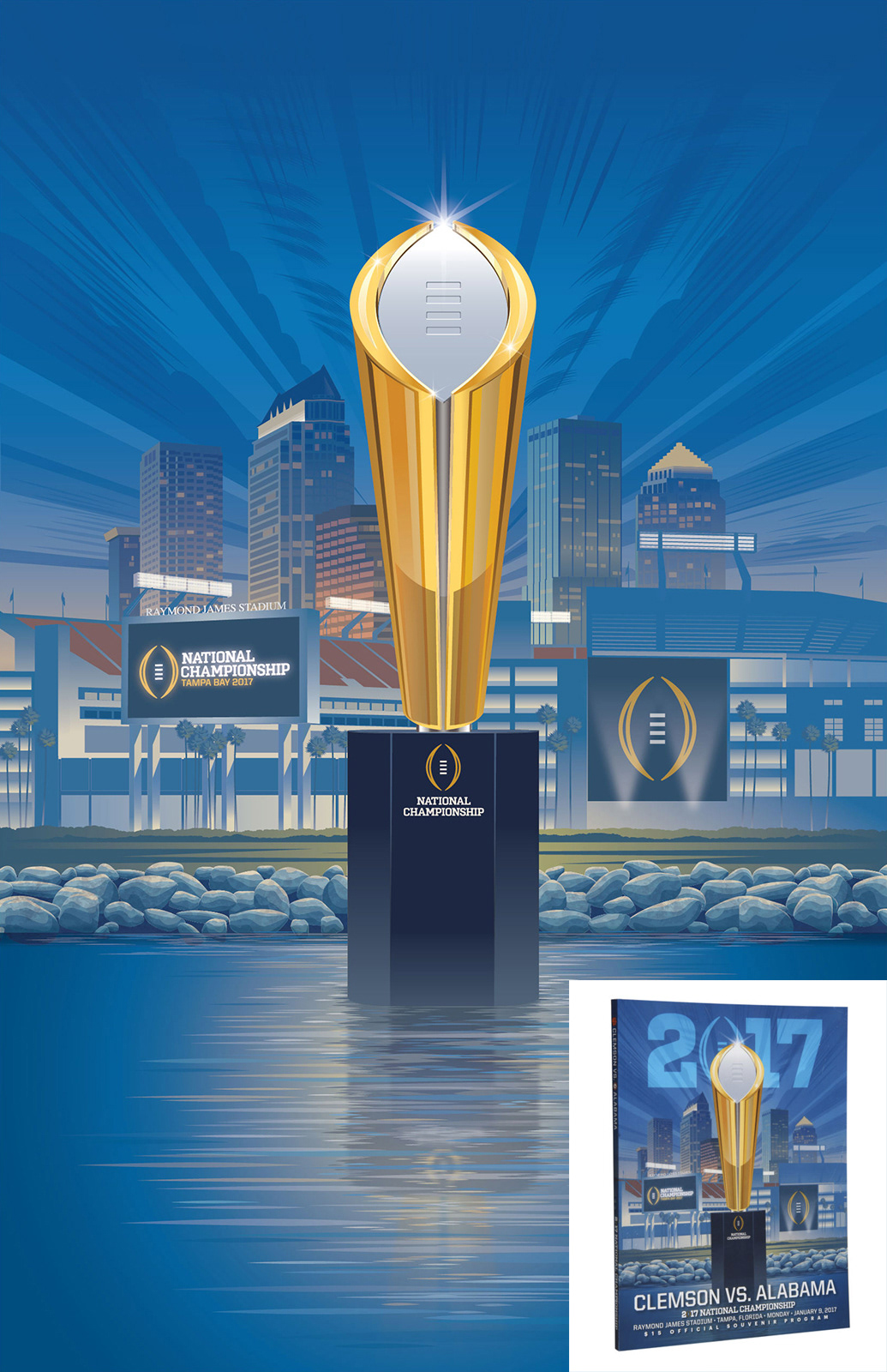 The Tampa Bay Skyline, the river walk, and the trophy were the subjects of this 27’ x 40’ poster that hung in every NCAA sports facility in the country. It was also used for the background of the ticket, and we did a night version for the cover of the program.