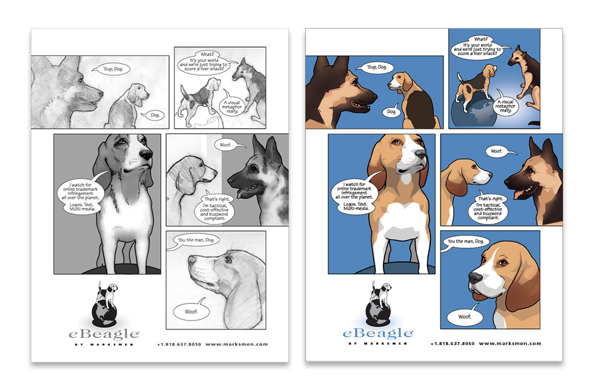 The preliminary sketches for this comic book style ad were scanned and opened in photoshop. A few paths and a few polygon lasso’s were drawn to map out the shapes. Then a minimal amount of airbrushing was done on a few of the shapes of each character.