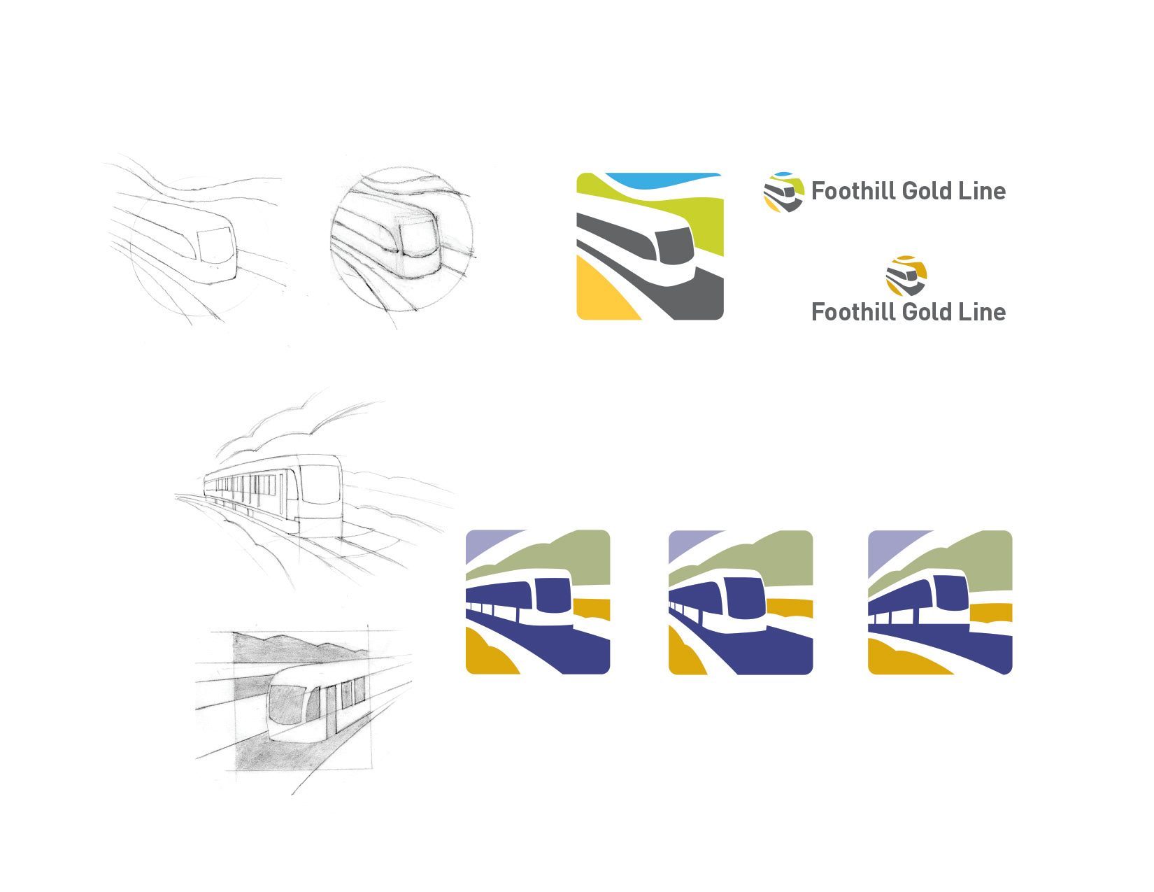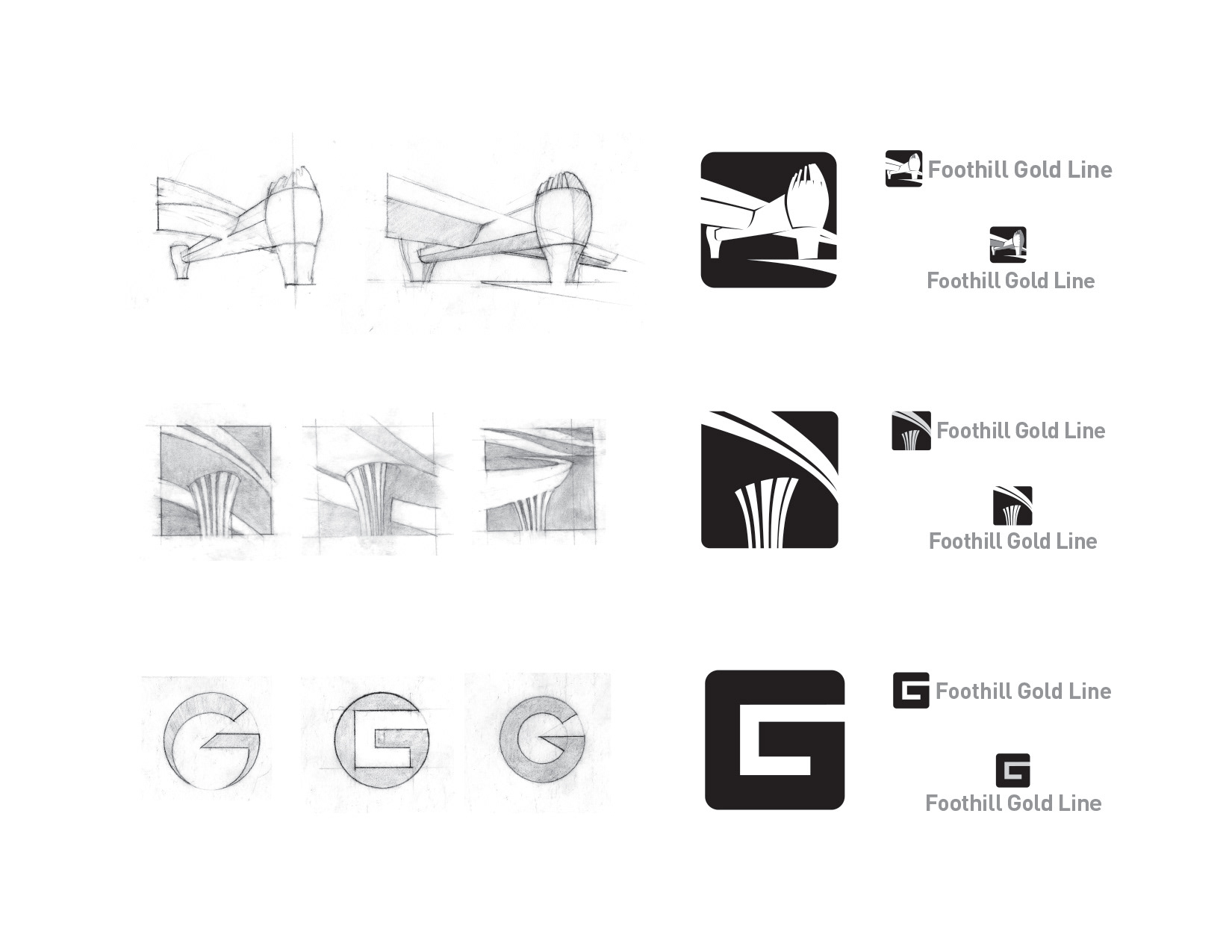 The first discussions for this logo concept included some form of the iconic bridge that crosses the 210 freeway in Arcadia with it’s fluted lower columns and basket shaped crests. A stylized rendition of the light rail car and the foothills eventually took precedence.