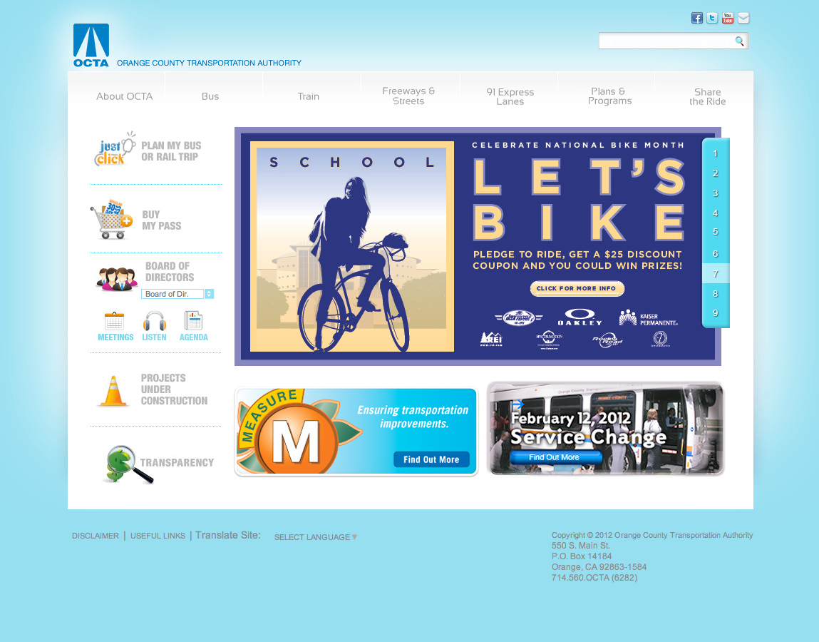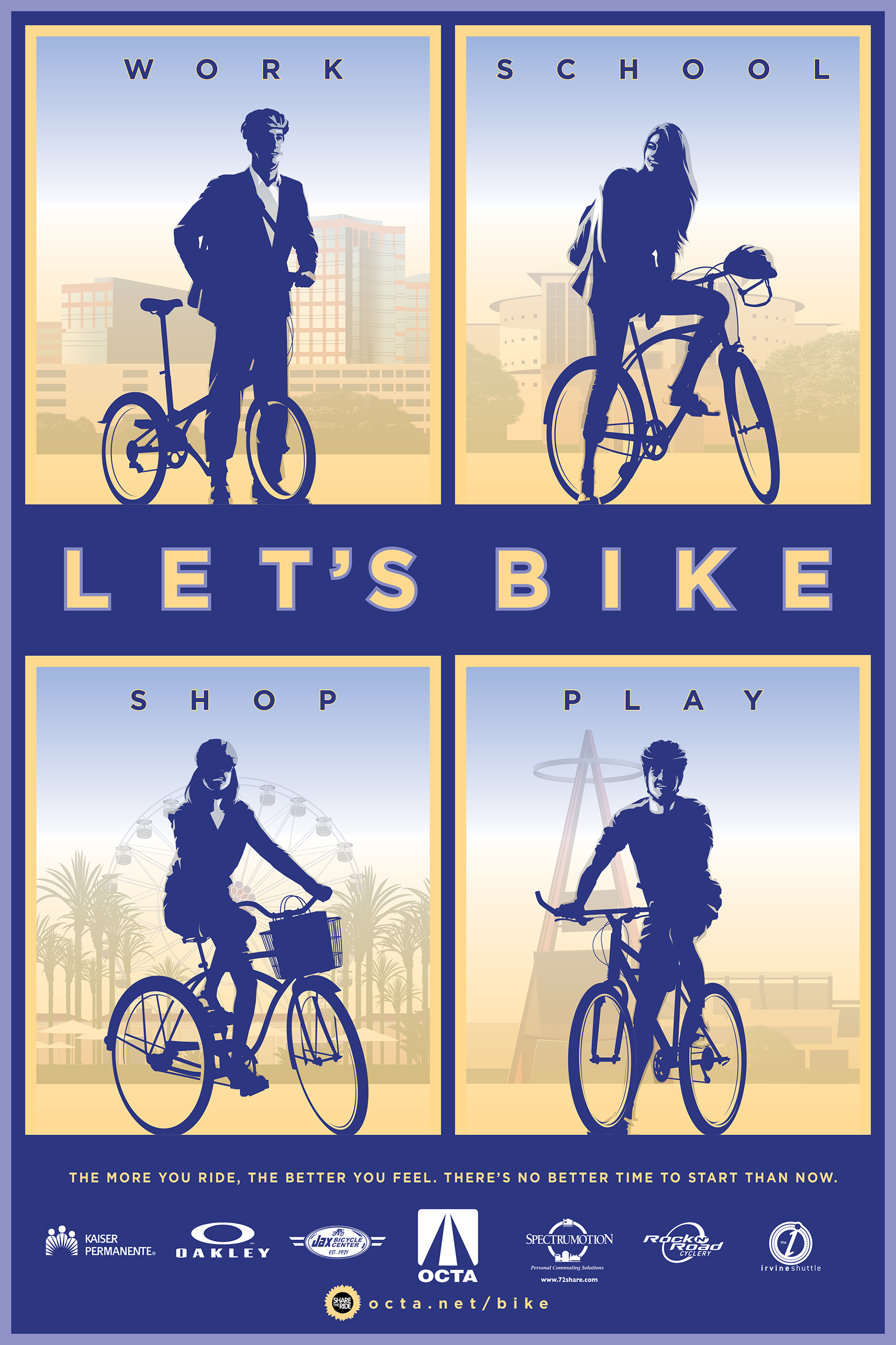 For this OCTA Bike to Work Month, we developed a character and background for each of the four categories represented for this campaign, Irvine, UCI campus, the Spectrum and Angels Stadium. Posters, home page banners, hand-outs, bus boards and wraps, were among the marketing elements for this month long event.