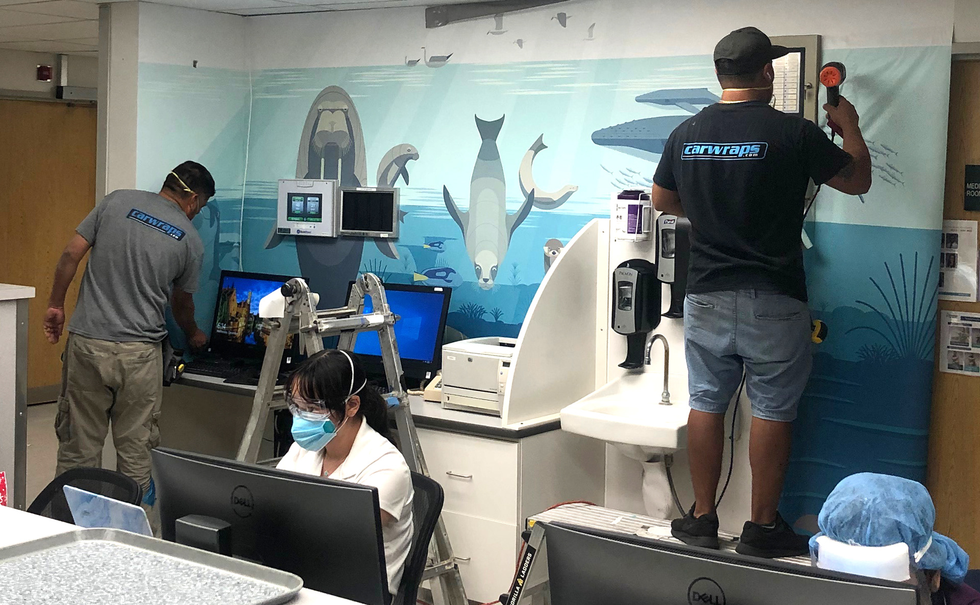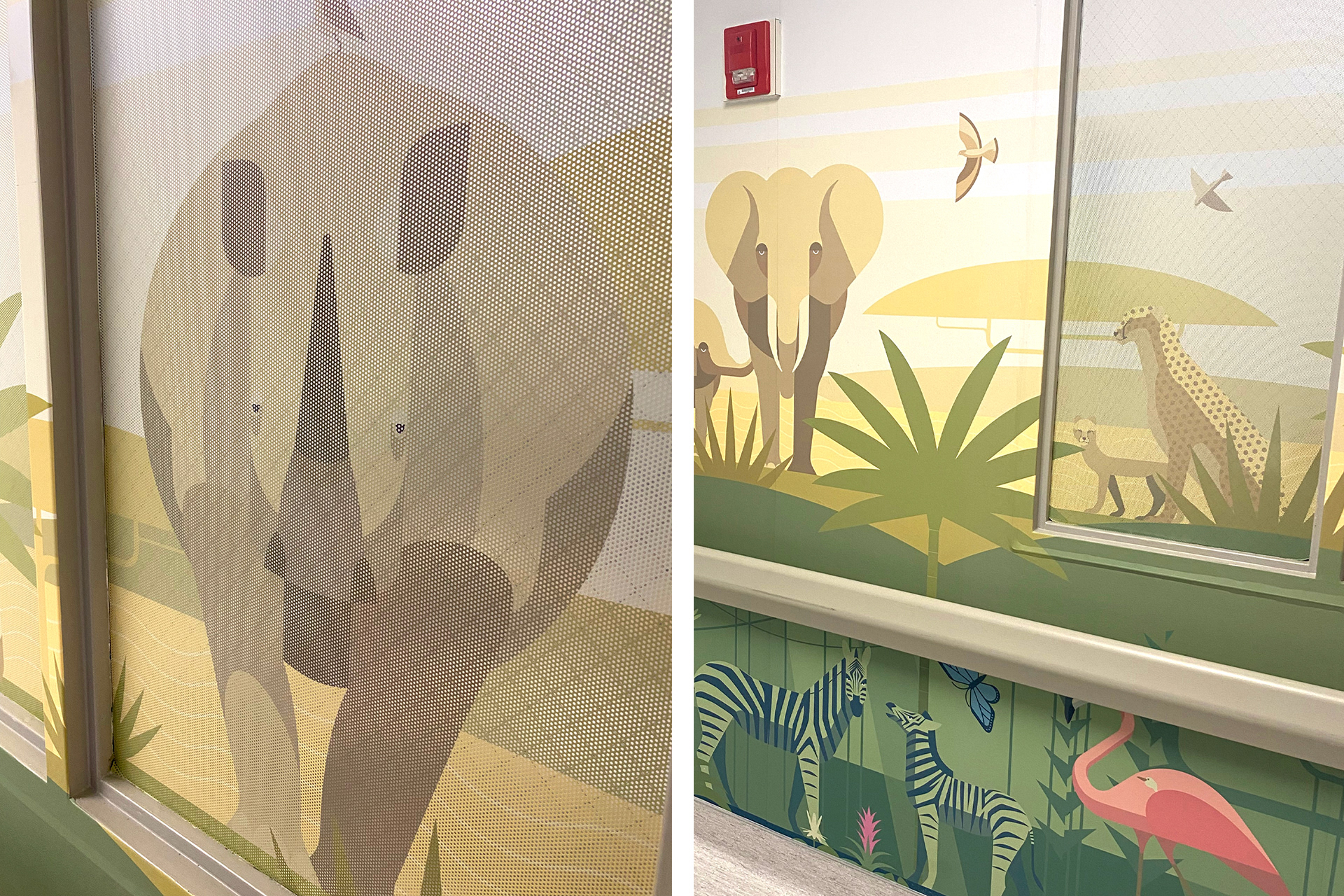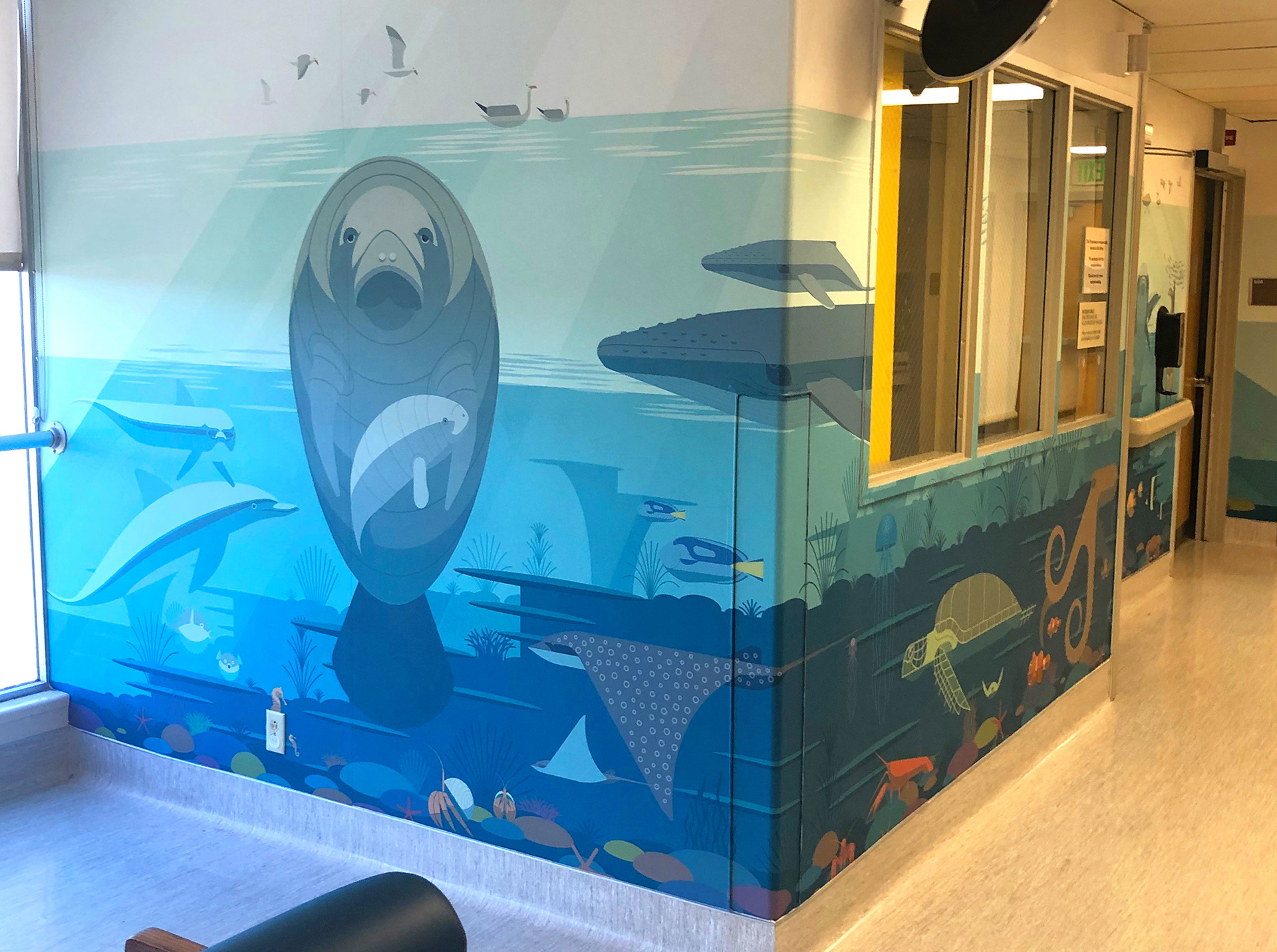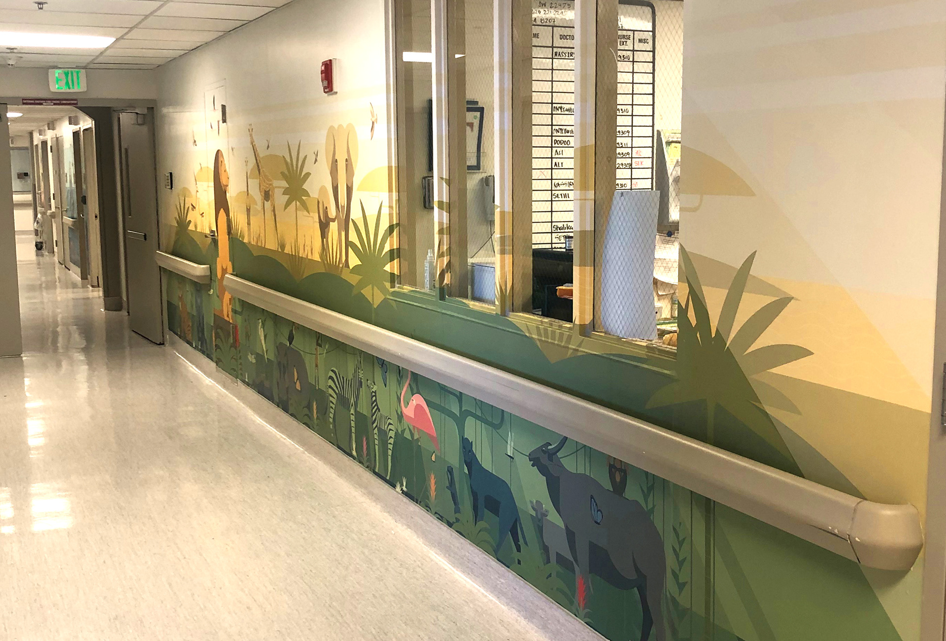 Parents or caregivers were the theme for this hospital pediatric floor mural, every adult appears with an adolescent. Over 200 sketches were done to develop the geometric characters and flora, for the ocean and jungle themes. 175 linear feet, floor to ceiling, on both sides of the U shaped corridor, with themes mixed throughout. The design needed to work around elements like wall rails, PPE stations, hand sanitizers, emergency back-up lights, and many others.