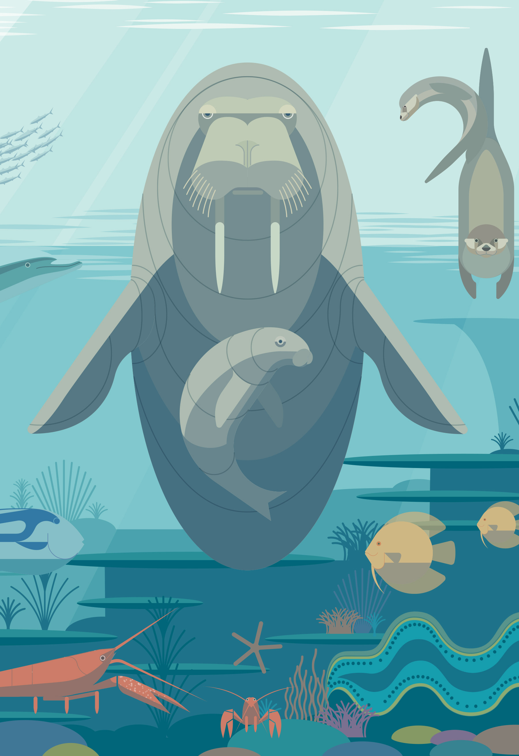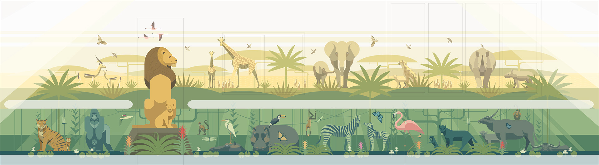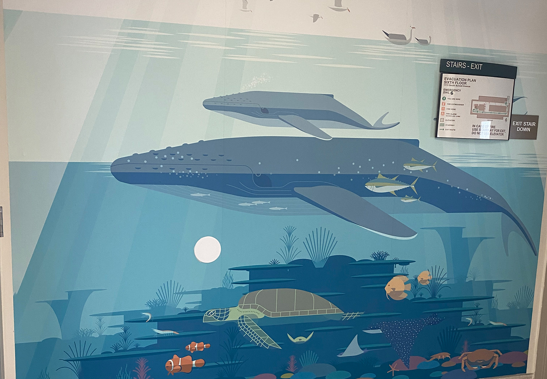 Parents or caregivers were the theme for this hospital pediatric floor mural, every adult appears with an adolescent. Over 200 sketches were done to develop the geometric characters and flora, for the ocean and jungle themes. 175 linear feet, floor to ceiling, on both sides of the U shaped corridor, with themes mixed throughout. The design needed to work around elements like wall rails, PPE stations, hand sanitizers, emergency back-up lights, and many others.