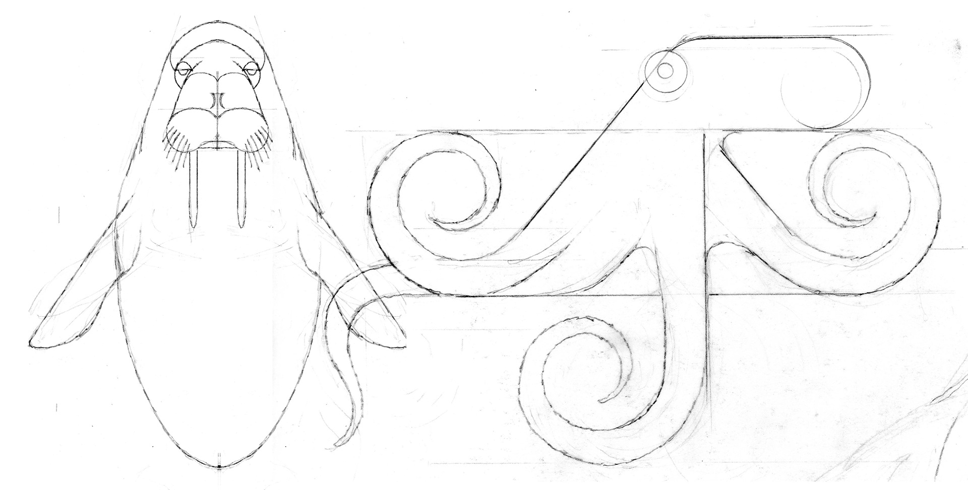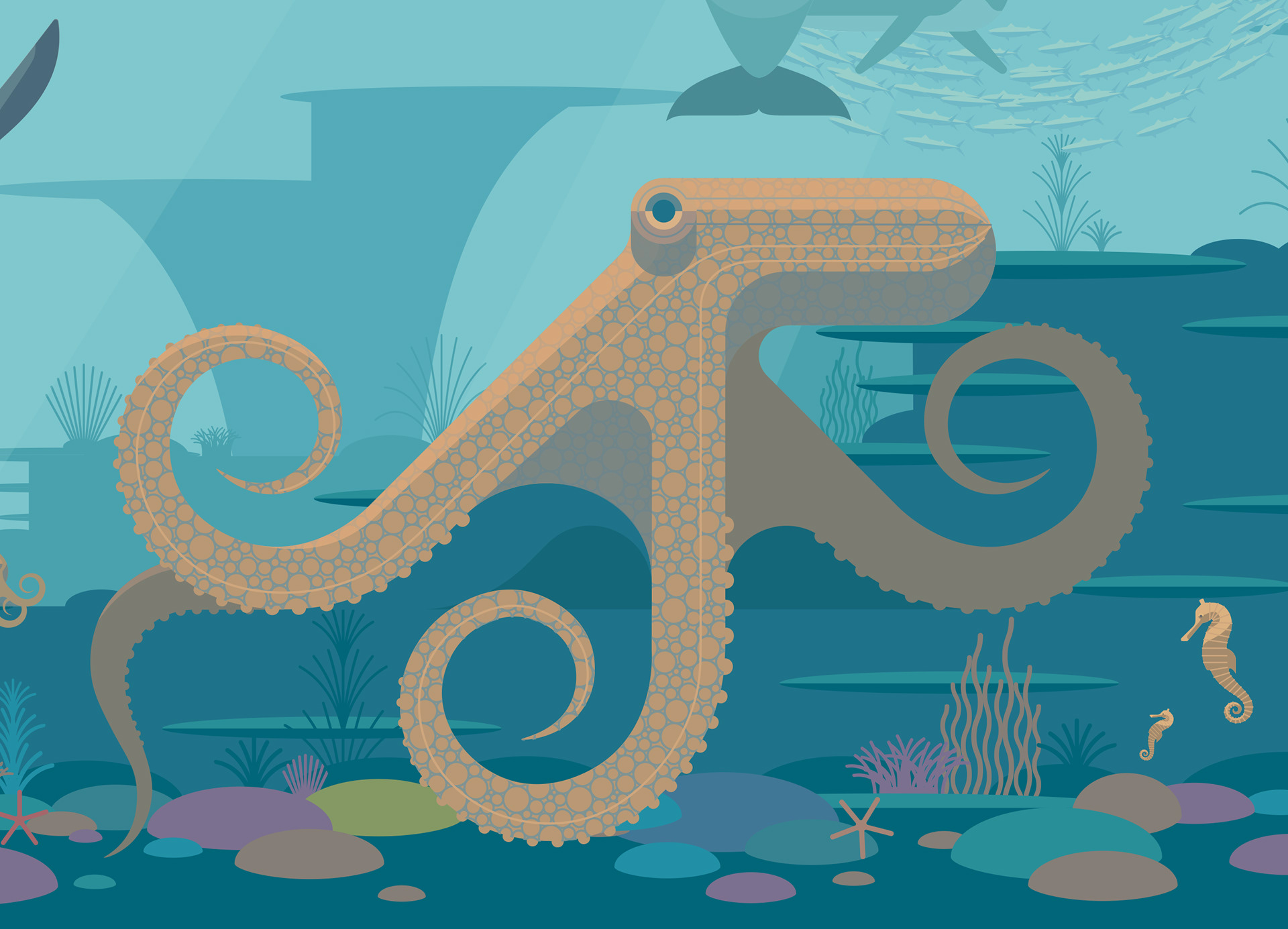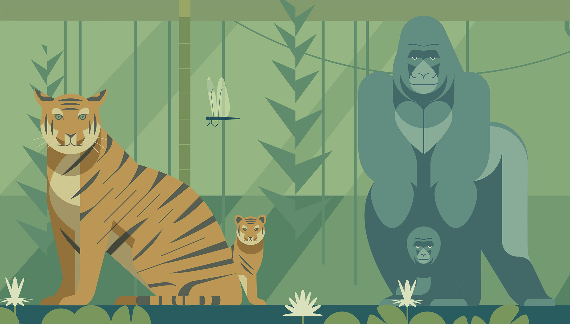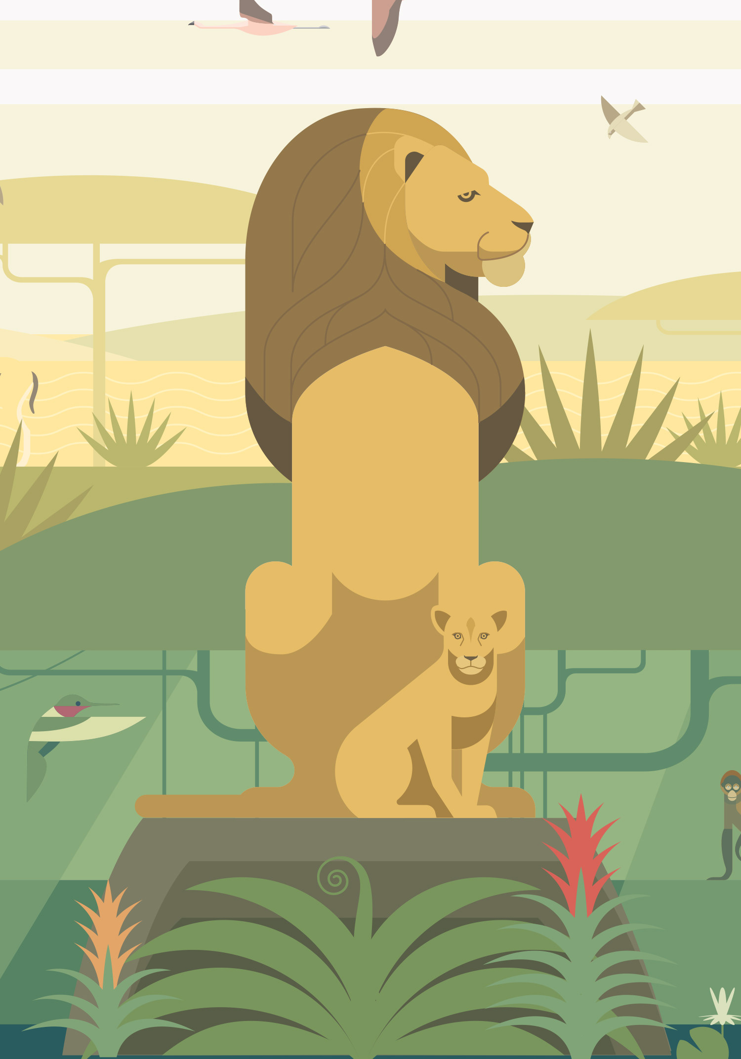 Parents or caregivers were the theme for this hospital pediatric floor mural, every adult appears with an adolescent. Over 200 sketches were done to develop the geometric characters and flora, for the ocean and jungle themes. 175 linear feet, floor to ceiling, on both sides of the U shaped corridor, with themes mixed throughout. The design needed to work around elements like wall rails, PPE stations, hand sanitizers, emergency back-up lights, and many others.